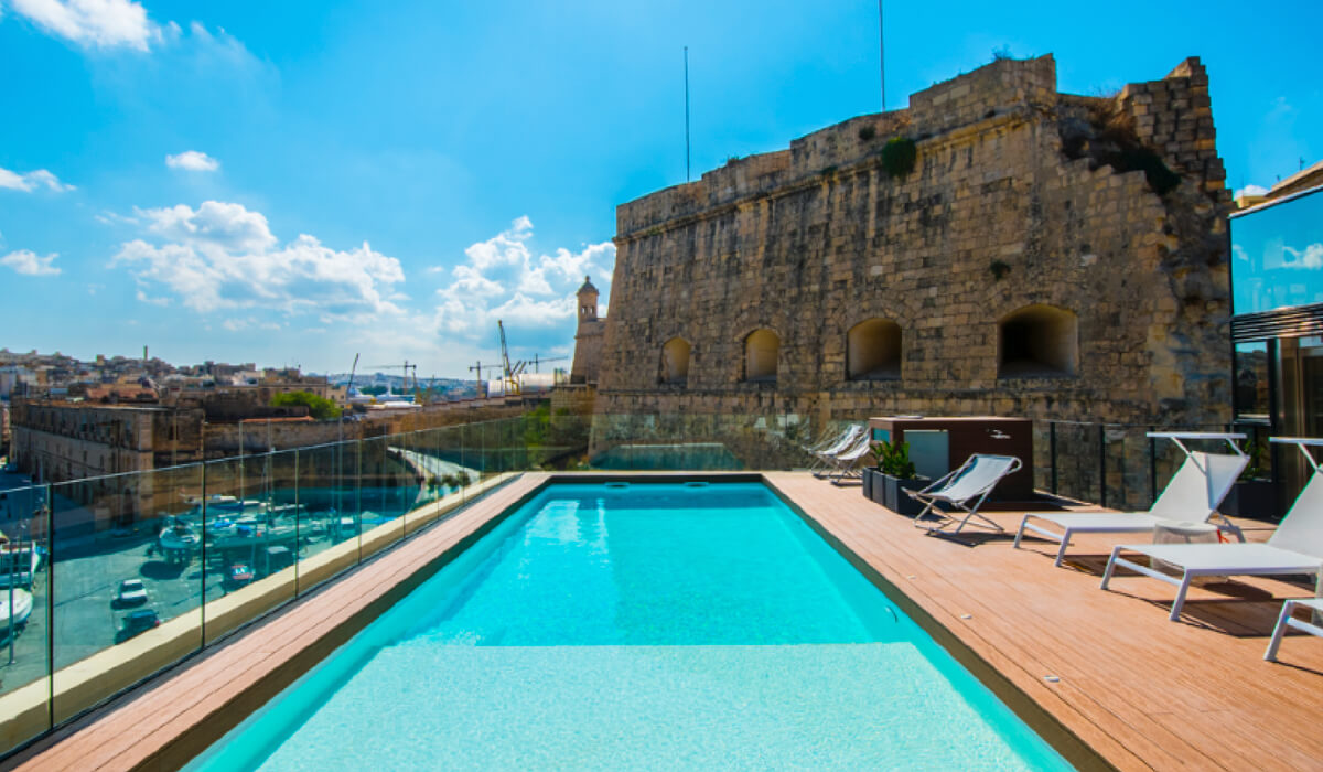- Piscina, inserita in un contesto molto discreto sul rooftop del palazzo annesso con una terrazza dalla vista mozzafiato su Vittoriosa e Cospicua